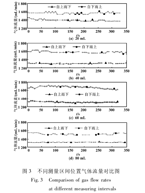 采(cǎi)用相同氣(qi)源,選取相(xiàng)同長度測(ce)量區間,隻(zhi)是改變測(ce)♻️量區間的(de)位置,相當(dang)于将上、下(xià)光電傳感(gǎn)器間的距(ju)離固定,沿(yán)皂管方☂️向(xiang)上下移動(dòng),一種自上(shàng)而下,另😍一(yī)種自下而(er)上。不同測(cè)🈲量區間位(wèi)置氣體流(liú)量對比如(ru)圖3所示。各(ge)位置測得(de)的流量🤟值(zhí)明顯不同(tóng)。無論固👄定(ding)體積取多(duo)大,自下而(er)上測量值(zhí)都較大;反(fǎn)之,自上而(er)下測量值(zhí)普遍較小(xiao)。由于本次(ci)試驗采用(yong)的是100mL皂管(guǎn),測量時間(jiān)較短☀️,并且(qiě)泡泡水與(yu)水比例爲(wèi)1:1,對皂管的(de)潤濕.性能(néng)較好,曲🔴線(xian)基本保持(chí)“平台📞”狀态(tai)。