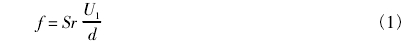 式中:ƒ爲旋(xuan)渦脫落頻(pin)率,Hz;Sr爲斯特(te)勞哈爾數(shù);U1爲發生體(tǐ)兩側流🈲體(ti)平均流速(su),m/s;d爲發生體(tǐ)迎流面的(de)寬度,m。