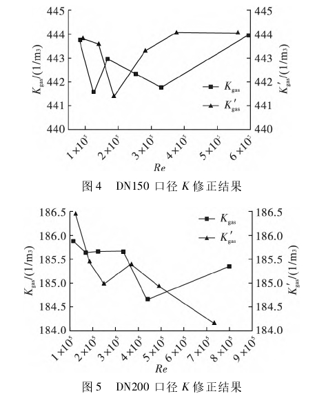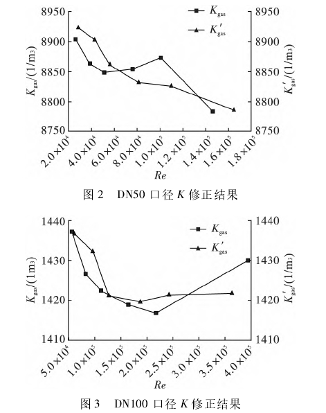 四(si)台不同口(kǒu)徑實驗用(yong)渦街流量(liang)計儀表系(xì)數K的修正(zheng)結果如圖(tu)2~5所示。
