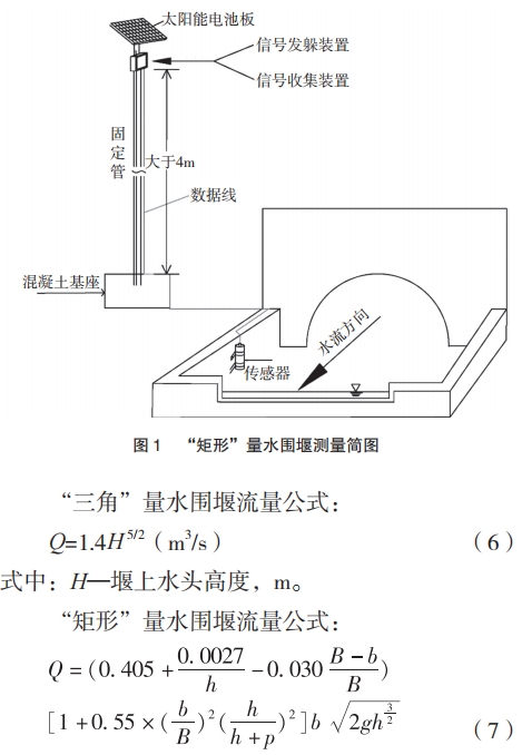 在(zài)傳統“三角(或矩(jǔ)形)”量水圍堰[7]内(nei)安裝電感傳感(gǎn)器,電感傳感器(qi)将其四周水位(wèi)産生的壓力及(ji)流速轉化爲❗電(diàn)流或電壓,通過(guo)電纜數據線傳(chuán)輸至控制箱,再(zai)通過✨信号發射(she)裝置發送至信(xìn)号收集裝置,最(zuì)終可直接讀取(qu)排水瞬時流量(liang)和累計流量。“矩(ju)形”量水😘圍堰測(ce)量原理見圖1,流(liú)量計算公式如(rú)下: