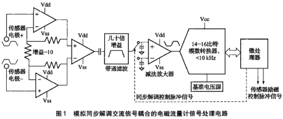 現代工業電(dian)磁流量計從(cóng)20世紀50年代産(chan)品問世以來(lái)随着電子技(ji)術和計算機(jī)技術的發展(zhan)逐漸成熟完(wan)🐆善和智能🎯化(huà),智能化的重(zhòng)要标志是微(wēi)處理器的使(shǐ)用。電磁流量(liang)傳感器輸出(chu)的高💃内阻、高(gao)共模且微弱(ruo)的有用信号(hao)不能被微處(chù)理器直接接(jiē)受,需要模數(shu)❤️轉換器首先(xiān)對傳感器輸(shū)出的模拟信(xìn)号進行數字(zì)化。直到21世紀(ji)初之前工業(yè)用途的分辨(biàn)率高、低噪聲(shēng)❤️模數轉換器(qi)仍是✏️稀少和(hé)💔昂貴的商品(pin),所以傳感器(qì)信号必需被(bèi)放大數百至(zhì)上千倍後再(zài)數字化,從而(er)可以使用成(chéng)本較低同🐅時(shí)分辨率也較(jiao)低的模數轉(zhuan)換器。從20世紀(ji)的工業電磁(cí)流量計産品(pin)進化來的、目(mù)前仍然很常(cháng)見的信号處(chu)理電路通常(chang)包括前置放(fàng)大,後級放大(dà),帶通濾波,采(cǎi)樣保持,模數(shu)轉換等。如圖(tú)1所示:微伏級(jí)的信号被前(qian)置放大器放(fang)🌂大約十倍後(hou)🐅交流耦合至(zhì)後級;接着使(shi)用帶通濾波(bō)器把信号進(jin)一步放大幾(ji)十倍近🆚伏級(ji)。被放👨❤️👨大近伏(fú)㊙️級的信号經(jing)過微處理器(qi)🏃🏻控制的采樣(yang)保持電路濾(lü)除尖峰,變成(cheng)緩慢的直流(liu)☀️信号送入模(mo)數轉換器。該(gai)方法對模數(shù)轉換器的性(xìng)能要求⭐不高(gāo),通常14~16比特的(de)分辨率和幾(ji)千赫茲的輸(shu)出數據率即(jí)可。它的優點(diǎn)是❤️成熟穩定(ding)和被廣泛驗(yan)證,缺點是放(fàng)大電路級數(shu)較多、增益倍(bèi)♍數較高造成(cheng)電路結構複(fu)雜,容易振蕩(dàng),線性損失,過(guo)長的低通濾(lü)波時間常數(shù)💃🏻會影響對流(liú)量階躍變化(huà)👣做出📧迅速響(xiang)應,另外在物(wù)料成本、功耗(hào)、電路尺寸、可(kě)靠性等方面(miàn)也有劣勢。