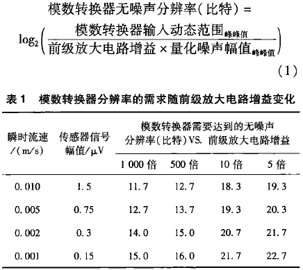 電(diàn)磁流量傳感(gǎn)器的響應通(tōng)常爲150 μV/( m/s)到200μV/(m/s),因爲(wei)調制勵磁電(diàn)㊙️流🔞的換向,傳(chuan)感器的輸出(chu)信号幅值加(jiā)倍。以150 μV/( m/s)(300 μV峰峰值(zhí))響應爲例,對(dui)0.3~15 m/s流速的量🔞程(cheng)範圍,傳感器(qì)輸出信号幅(fu)值在90 μV峰峰值(zhi)到4.5 mV峰峰值之(zhī)間。保證流速(su)信号被模數(shù)轉換器正确(que)分辨✂️的最低(dī)要🔅求是出現(xiàn)🚶在模數轉換(huan)器輸人端的(de)傳感器信号(hao)幅值不得大(dà)于模數轉換(huàn)器噪聲的一(yi)半。模數轉換(huan)器無噪聲分(fèn)辨率的計算(suàn)公式如式(1)所(suo)示。瞬時流速(su)對應的傳感(gǎn)器信号幅值(zhí)可被當作對(duì)模數💚轉換器(qì)噪聲的最低(di)要求。由表1可(ke)見前級放大(da)電路增益越(yuè)低對模數轉(zhuan)換器的無噪(zao)聲分辨率指(zhi)标的要求越(yue)高。這是20世紀(jì)後期數十👈年(nian)裏在缺少✂️成(chéng)本可負擔、高(gao)分辨率的模(mo)數轉換器的(de)條件下,