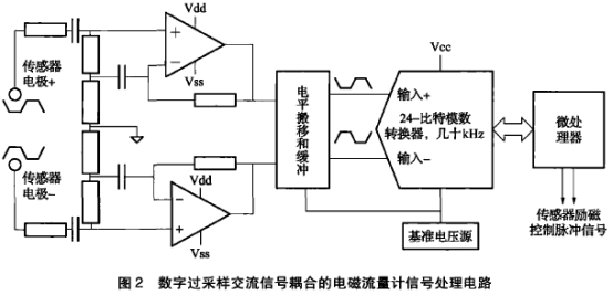 電(diàn)子進步使得(de)在本世紀初(chū)開始出現越(yue)來越多性🎯價(jià)比更好的低(dī)噪聲24比特模(mó)數轉換器産(chan)品。随之出現(xiàn)的♉數字過采(cǎi)樣交流信号(hao)耦合放大是(shi)一種改進的(de)電路結構。如(ru)圖2所示傳感(gan)器電極輸💋出(chū)信号使用電(diàn)容耦合⛹🏻♀️,在前(qian)置放大級采(cai)用自舉電路(lù)提高輸人阻(zu)抗,真差分輸(shū)出到模數轉(zhuan)換器。省略模(mo)拟帶通放🔞大(dà)、采樣保持等(děng)電路。較高速(sù)的👅模數轉換(huan)器對前置放(fang)大器的🎯輸出(chū)做過采樣。微(wēi)處理器在數(shù)字域内重建(jiàn)♉流速信号波(bo)形、同步解調(diao)交流信号、濾(lü)除尖峰和㊙️噪(zào)聲,計算流速(sù)信号。該電路(lu)與前一-種電(diàn)路相❓比的優(you)點是:更少的(de)元♋件,更低的(de)價格,真差分(fèn)信号的抗幹(gàn)擾,接受較寬(kuan)的輸人共模(mó)電壓範圍。