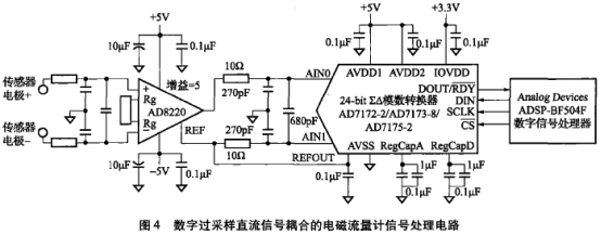 本文電磁流(liu)量轉換器信(xin)号處理電路(lù)如圖4所示。電(diàn)磁流量傳感(gǎn)器的一對電(dian)極輸出經過(guò)射頻濾波阻(zu)容網絡直流(liu)耦合至🎯±5V供電(dian)🤞的AD8220結型場效(xiao)應管輸入儀(yí)表放大器輸(shu)入端。AD8220的增益(yi)設置爲5倍,參(cān)⛱️考電平管腳(jiao)🌈連接到AD7172-2模數(shù)轉換器㊙️的2.5 V内(nei)部基準源輸(shū)出,把儀放輸(shū)出信号的電(dian)平擡高至正(zhèng)極性。被AD8220調理(lǐ)後的傳感器(qi)信号直流耦(ǒu)🐪合至+5 V供電的(de)AD7172-2第0号輸人通(tōng)道,AD7172-2的2.5V内部基(ji)準源輸出接(jiē)第1号輸人通(tong)道,兩個通道(dao)組成0~5 V僞差分(fen)✉️輸🥰人。AD7172-2 的輸出(chu)數據率❌設爲(wei)31 250 Hz ,數字量化後(hou)的樣點送入(ru)ADSP-BF504F數字信号處(chù)理器進行同(tóng)步解調數字(zì)濾波和🐇流量(liàng)🈲計算、線性化(huà)補償🥵、電流或(huo)脈沖輸出等(děng)處理。該方案(an)㊙️試圖吸取數(shu)字過采樣交(jiāo)流信号耦合(hé)的電磁流量(liàng)計信号放大(dà)電路優點的(de)🔞同時💁避免其(qi)共模抑制比(bǐ)損失的缺🐆點(dian)。通過使用比(bǐ)傳統方💯案低(di)一到二百倍(bèi)的模拟增益(yì)并結合軟件(jiàn)的方法解決(jue)直流耦合帶(dai)來的信号飽(bǎo)和問題。因爲(wèi)放大✂️器增益(yì)隻有5倍, ±5 V供電(diàn)的AD8220的軌到軌(guǐ)電壓輸出範(fan)圍的上限是(shì)4.8V,單5V供電且集(ji)成真軌到軌(guǐ)☂️輸人緩沖器(qi)的AD7172-2的輸人電(diàn)壓範圍是0~5 V。所(suo)以放大器輸(shu)人動态範圍(wei)等于(4.8-2.5) +5=0.46(V),折合150 μV/(m/s)響(xiang)應的傳感器(qì)在3 067 m/s流速的🈲輸(shū)出(這僅是理(li)論值,實際流(liu)速不可能這(zhe)麽高)。這表明(míng)該電路設計(ji)能夠處理極(ji)寬廣的流速(su)🌍範圍。該電路(lu)的非線性誤(wu)差由🤩儀表放(fàng)大器和模數(shu)㊙️轉換器的非(fei)線性低指标(biao)共同決定。AD8220和(hé)AD7172-2的數據手冊(cè)标稱其非線(xian)性誤差典型(xing)值分别是5PPM和(he)±2PMM,所以該電路(lù)💔設計具有線(xiàn)性佳。