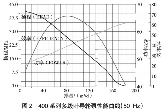 潛油(you)電泵機(jī)組都遵(zun)循GB/T16750--2015《潛油(yóu)電泵機(ji)組》,出庫(kù)的時候(hou)都會㊙️進(jin)行泵性(xing)能測試(shì),繪制泵(beng)性能曲(qǔ)線,也就(jiu)是泵揚(yang)程、排量(liàng)、泵效、軸(zhóu)功率曲(qǔ)線”。要求(qiu)至少采(cǎi)集13個點(dian),即🌈在不(bu)同排量(liàng)下的壓(ya)力、泵效(xiao)、功率數(shù)據,來給(gei)定泵的(de)有效高(gāo)效區間(jiān),用以指(zhi)導.用戶(hu)生産。圖(tú)2爲50Hz工頻(pín)運行🈲的(de)數據曲(qǔ)線,給定(dìng)的高效(xiao)區爲40~150m3/d。
