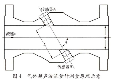 氣體(ti)超聲波流(liú)量計測量(liàng)原理如圖(tu)4所示。它是(shì)利用1對超(chāo)聲波傳感(gǎn)器安裝在(zai)管段上下(xia)遊兩側,傳(chuán)感器A和傳(chuán)感器🤩B相互(hù)💃🏻發送和接(jiē)收超聲波(bō)信号,通過(guo)觀測超聲(sheng)波在介質(zhì)中的順流(liú)和逆流傳(chuan)播的時間(jiān)差值來計(jì)算流📧速,從(cong)而可應用(yòng)流速來計(ji)算介質體(tǐ)積流量的(de)一種間接(jiē)測量方法(fǎ)。