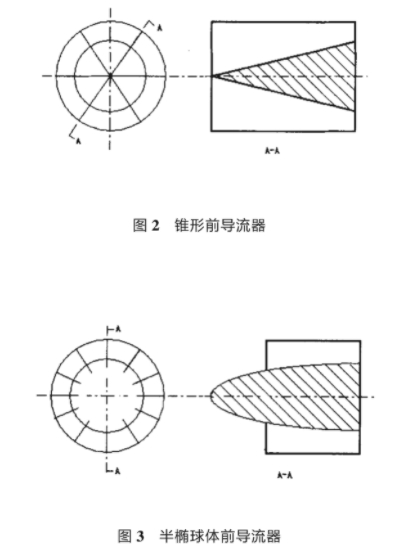 圖2和(hé)圖3分别爲兩(liang)種結構的前(qian)導流器示意(yi)圖。圖2爲渦輪(lún)流量計常用(yong)結構,葉片數(shù)爲6導流.體形(xíng)狀由流入至(zhi)流出呈錐形(xing),葉片長與錐(zhuī)體高度相同(tóng).圖3爲本文改(gai)進的前導流(liú)器結構示意(yì)圖其主要特(tè)點是将錐體(ti)改爲半橢球(qiú)體😄,葉片數增(zeng)加到12并把葉(ye)片長度📐縮小(xiao)1/3.