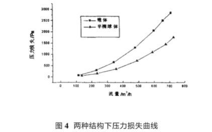 圖4是兩種結(jie)構下,流體經(jing)過流量計後(hou)的壓力損失(shi)曲✊線。由圖🔞4可(kě)✉️看出在流量(liang)<100m³/h時,壓力損失(shi)不受導流器(qi)結構的影👄響(xiǎng)而且壓損很(hen)小。随着流量(liàng)增大,改進的(de)導流器的壓(ya)損明顯低于(yu)錐體🎯導流器(qi)在最大流量(liang)600m³/h處錐體的壓(yā)損約爲半橢(tuǒ)球體☎️的2倍,可(ke)見導流器的(de)🐇結構對流量(liàng)計壓力損失(shī)有不容忽視(shì)的影響作用(yòng)。