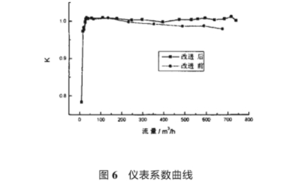圖6爲分别(bie)采用錐體和(he)半橢球體導(dao)流器,流量計(jì)儀📱表🆚系數的(de)測🐉試結果。由(yóu)圖可看出采(cǎi)用改進的導(dǎo)流器後💯流量(liàng)⭐計儀♍表系數(shu)比改進前有(you)較好地改善(shàn)在量程範圍(wei)内50m³/h~600m³/h),K很好地體(tǐ)現常系數的(de)特🔴性甚至在(zai)超過最大量(liang)程後能繼續(xù)保持水平直(zhí)線狀态。改進(jin)前🌈的流量計(ji)K值也較好,但(dan)随着流量增(zēng)大直線略向(xiang)下傾斜偏離(lí)了水平位置(zhì)。