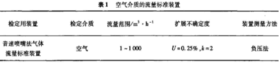 表(biǎo)1爲采用以空(kōng)氣爲檢定介(jiè)質的流量标(biāo)準裝置的參(cān)數信息。