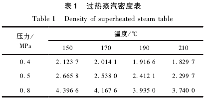 根據孔闆流(liu)量計運行的(de)溫度、壓力區(qū)間,查詢過熱(rè)蒸汽密度表(biǎo)如表1所示。