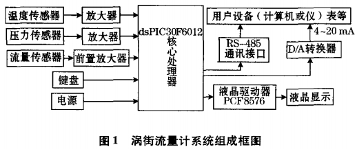 根據(ju)渦街流(liu)量計的(de)特點和(hé)數字信(xin)号處理(li)的運算(suan)要求♍,選(xuan)擇🤞了dsPIC30F6012單(dān)片機作(zuò)爲核心(xin)部件,它(tā)是一種(zhong)16位微處(chù)理器。其(qi)内部集(jí)成🔆有1個(gè)16位CPU和1個(gè)DSP内核,當(dāng)内部時(shi)鍾頻率(lǜ)爲最高(gāo)120MHz時📞,進行(hang)1次16bitx16bit運算(suàn)爲8.3ns等特(tè)點。系統(tong)組成主(zhu)要包括(kuo):檢測電(diàn)路、放大(da)電路、顯(xiǎn)🏃♀️示電路(lu)、通信接(jie)口電路(lù)等,其系(xì)統組成(chéng)框圖如(rú)圖1所示(shi)。渦街傳(chuan)感器采(cai)集流量(liang)信号,壓(ya)力、溫度(du)傳感器(qì)采集流(liú)體溫度(dù)、壓🧡力信(xìn)号對流(liú)量信号(hao)加以實(shi)時補償(cháng)和修正(zheng)。