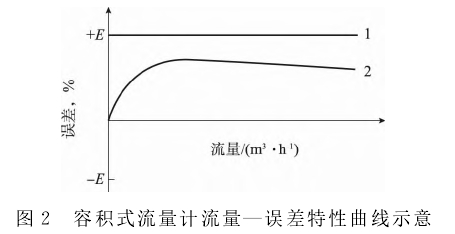 通過查找對(duì)各種容積式(shi)流量計進行(hang)檢定試驗的(de)大量數據,可(ke)得出容積式(shì)流量計的實(shí)際誤差曲線(xian)如圖2中曲線(xiàn)2。