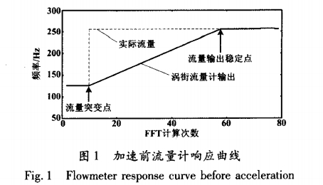 采用頻(pin)譜估計方法分析(xi)渦街信号的頻率(lǜ)是基于渦街流量(liàng)計信号是一個平(ping)穩随機過程信号(hào),并且流量在短時(shí)間内是穩定的或(huò)變化很小。由于渦(wo)街流量計輸出信(xìn)号實時性的要求(qiú),隻能對有限長時(shí)間段内的信号進(jin).行處理,即隻能截(jie)取一段數據進行(hang)頻譜分析。爲了防(fang)止數據統計變異(yì)性對計算渦街頻(pin)率的影響,必須對(duì)若幹次頻譜分析(xī)的結果進行平均(jun1),這就需要花費時(shi)間。當平均次數多(duo)時,數字渦街流量(liang)計的響應速度就(jiù)會顯得比較慢。例(li)如,我們的系統采(cai)用時鍾頻率爲40MHz的(de)TMS320LF2407ADSP芯片,使用彙編語(yu)言編制FFT程序計算(suàn)渦街信号的頻譜(pu),對50次計算結果進(jìn)行平均。每次FFT計算(suàn)時間大概是300ms(包括(kuo)信号處理,人機接(jiē)口等對應的其他(tā)軟件執行時間),總(zong)用時大概爲15s,這個(ge)時間比較長。若在(zai)這段時間裏,流量(liang)發生突然變化,系(xì)統就需要計算50次(ci)FFT,才能反映流量的(de)變化,這将造成測(cè)量誤差,如圖1所示(shì)。