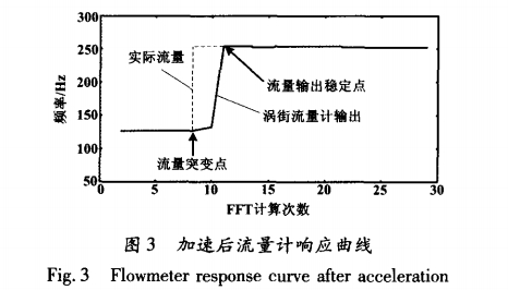 圖(tú)3爲經過加速處理(li)後40口徑渦街流量(liang)計在流量突變時(shí)的響應曲線。可見(jian),在流量突變後,系(xì)統經過3次FFT計算就(jiù)能跟上流量的變(bian)化,有效地提高了(le)流量計的響應速(su)度。