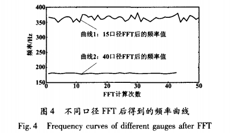 在小流量(liang)的時候渦街流量(liàng)計信号微弱,信噪(zao)比降低,信号質量(liang)比較差,頻譜分析(xi)得到的渦街頻率(lü)波動比較大。特别(bie)是小口徑渦街流(liú)量計,由于傳感器(qi)安裝等原因,這種(zhǒng)現象更爲明顯。圖(tú)4中,曲線1爲15口徑渦(wō)街流量計在下限(xian)頻率附近,每次FFT計(ji)算得到的渦街頻(pín)率;曲線2爲40口徑離(lí)下限頻率比較遠(yuǎn)時每次FFT計算後得(de)到的渦街頻率。可(kě)見,曲線1波動較大(dà),數值約爲30Hz。此時,即(jí)便采取平均措施(shī),也無法使輸出頻(pin)率值穩定。