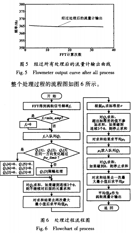 式中:ƒin爲處理後(hou)隊列Q1[N]中的頻率值(zhi);f。爲處理前隊列Q1N]中(zhong)的頻率值,即原先(xiān)FFT計算出來的頻率(lü)值;f,爲流量計最近(jìn)--次輸出的頻率值(zhi);c爲常數,可以根據(jù)實際情況選取,實(shi)驗中取1。需要注意(yi)的是,這裏是對Q1[N]處(chù)理,而不是對隊首(shǒu)元素Q1[1]處理。原因是(shì),Q1[1]~Q1[N-1]中的信息會反映(yìng)流量的突變,如果(guǒ)對其進行限幅處(chù)理,會影響系統的(de)響應速度。