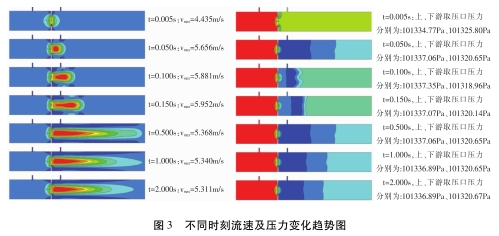 瞬态分(fen)析如圖(tu)3所示,以(yǐ)了解孔(kǒng)闆流量(liàng)計在進(jin)行工作(zuo)時👉,介質(zhì)的流動(dòng)狀态及(jí)壓力、速(sù)度實時(shi)分别情(qíng)況。設定(dìng)❄️進口♍流(liú)量✌️爲100m³/h,出(chu)口壓力(lì)條件爲(wèi)标準大(dà)氣壓、溫(wen)度爲20℃;孔(kǒng)🚶闆流量(liàng)計的結(jié)構設計(jì)造成氣(qi)流通道(dào)變窄(管(guǎn)道突然(ran)變徑),氣(qì)流進入(ru)管道短(duǎn)時間(0.005s)内(nèi)上遊取(qu)壓🌈口壓(ya)力突然(rán)增大,空(kong)氣流動(dòng)加劇,下(xia)遊管道(dao)壓力突(tū)然間變(biàn)小形成(chéng)負壓區(qū),但壓力(lì)分布不(bu)明顯,僅(jin)👈在孔闆(pan)口周圍(wéi)形成不(bú)同壓力(li)分層;下(xia)遊管道(dào)壓力出(chū)現明顯(xiǎn)分層、且(qie)逐漸趨(qū)📱于穩定(dìng)。