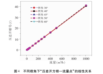 根據(ju)2.1參數設(shè)計,建立(li)模型,其(qí)他條件(jian)不變,隻(zhi)改變楔(xiē)角的大(dà)小❓,分别(bié)取φ爲30°、40°.45°、50°、60°條(tiáo)件下k系(xì)數的變(biàn)化規律(lǜ);仿真流(liú)程如3.1所(suo)述。得到(dao)結📧果如(rú)🛀圖4所示(shi),不同楔(xie)角下,“壓(ya)差開方(fang)根♊-流量(liàng)點🈲”均呈(chéng)理想線(xian)性關系(xi)(R2=1),圖像幾(ji)乎是重(zhong)合的,說(shuō)明楔角(jiǎo)對h系數(shu)影響較(jiao)🌍小;線性(xing)關系分(fen)别爲🥰: