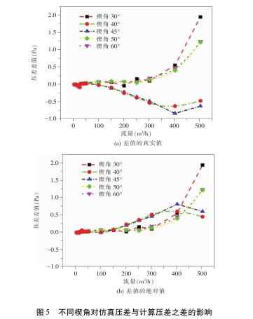 通過(guo)計算,不(bu)同楔角(jiǎo)條件下(xià),仿真壓(yā)差與計(ji)算壓差(cha)基本一(yi)緻,如圖(tú)5所示,